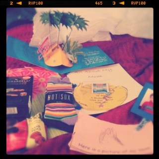 Sunday: some of my Mother’s Day loot. Chocolate (of course), funky socks, and homemade books. Plus a card with a tropical island and tropical music in it (no drink with an umbrella in it though). I also got a color bowl (flower pot) for the front porch AND, drumroll please, I did not have to wash a dish all freakin’ day. Hallelujah!